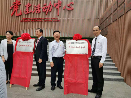 圖為康芝黨支部書記何子群與旅游學校黨支部負責人共同完成揭牌儀式
